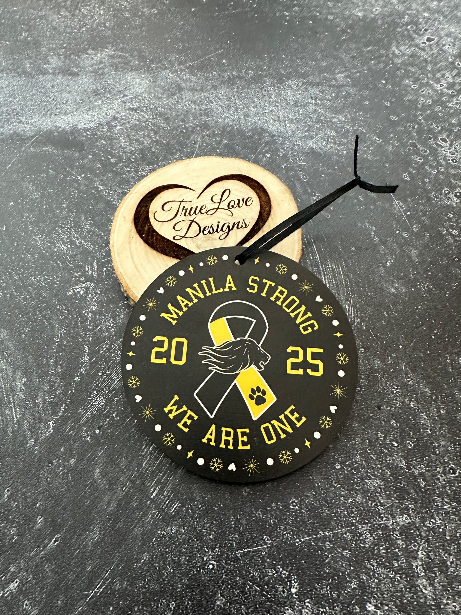 Show your support for the Manila community with this meaningful Manila Strong – We Are One ornament. Created to honor the teens involved in the tragic accident on Friday, this ornament symbolizes unity, strength, and the unwavering love our community continues to show.