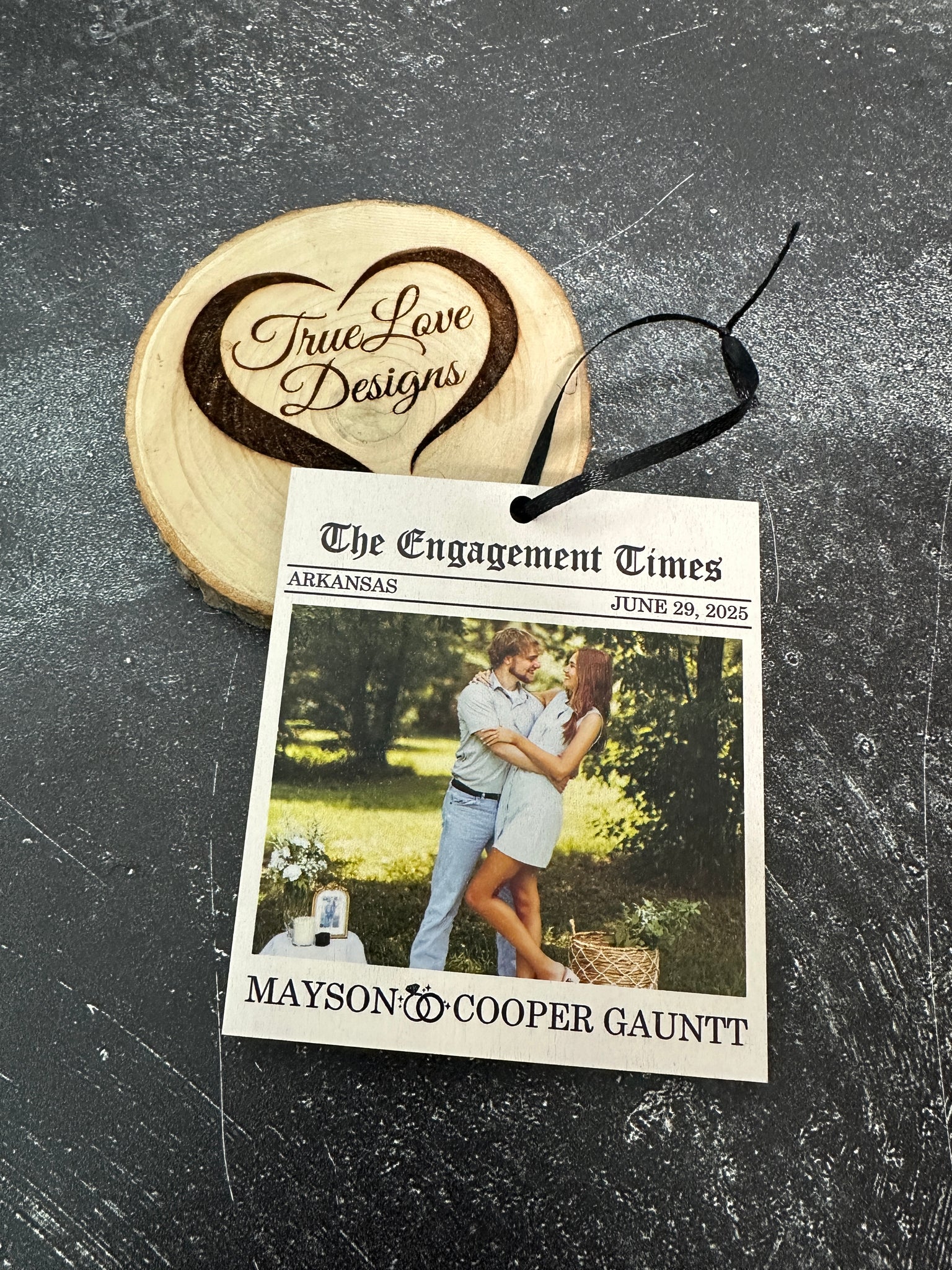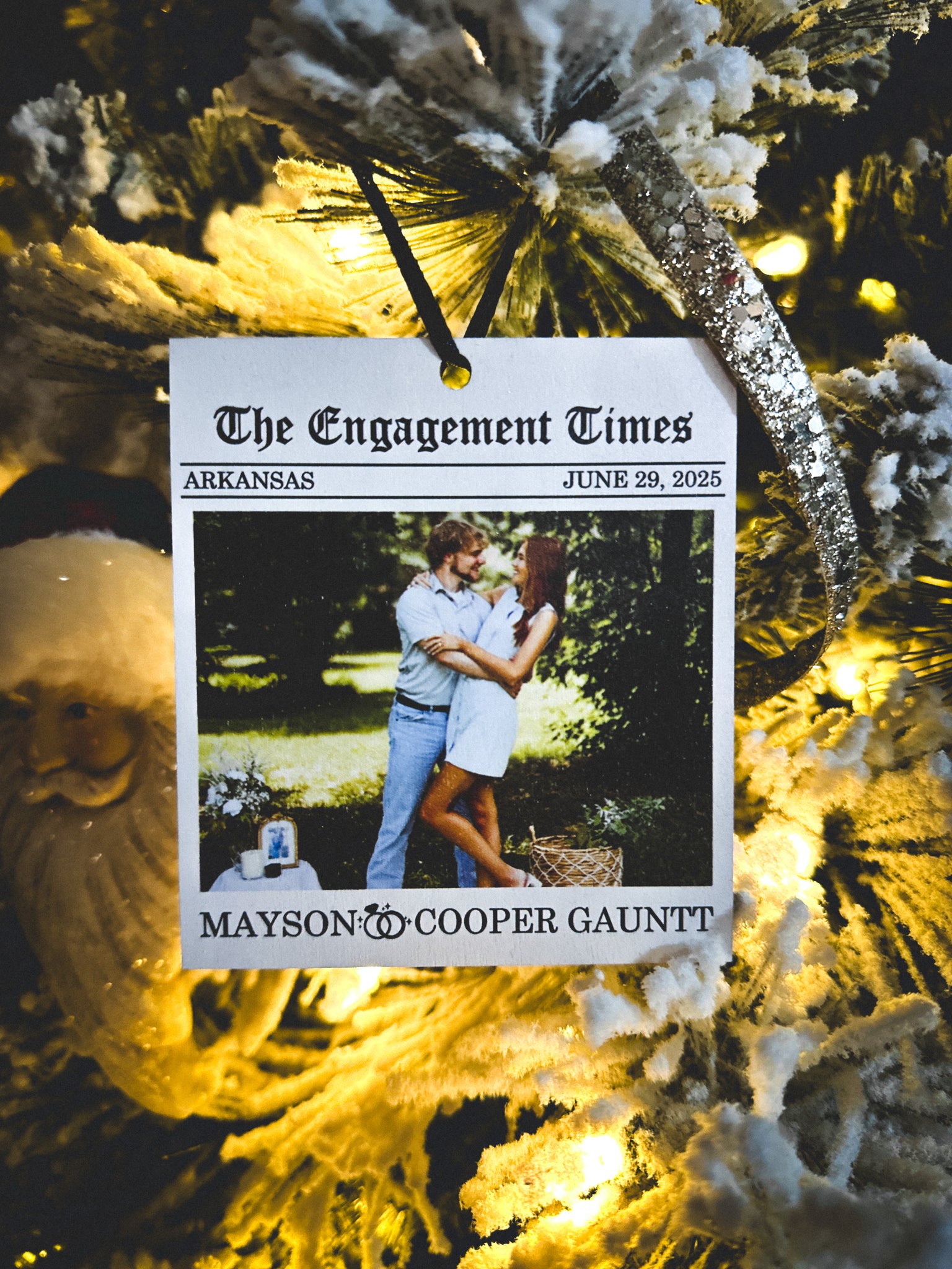 Newspaper Style Engagement Ornament – Personalized Headline, Location, Date & Name Plate • Custom Photo Christmas Ornament Keepsake 2025